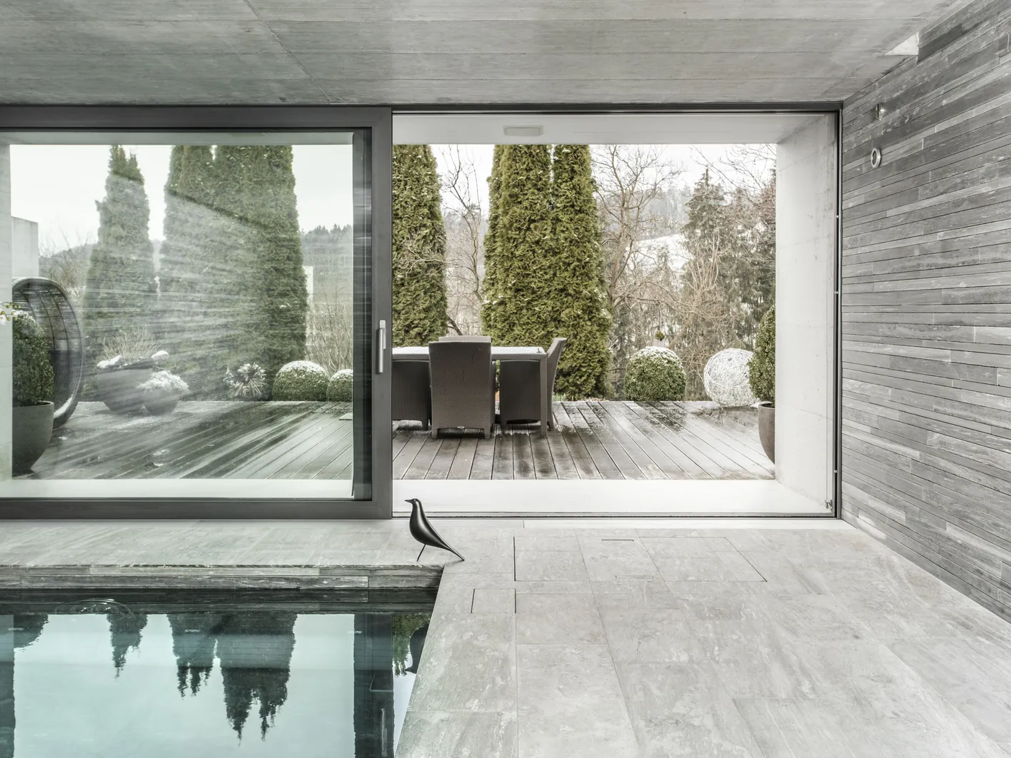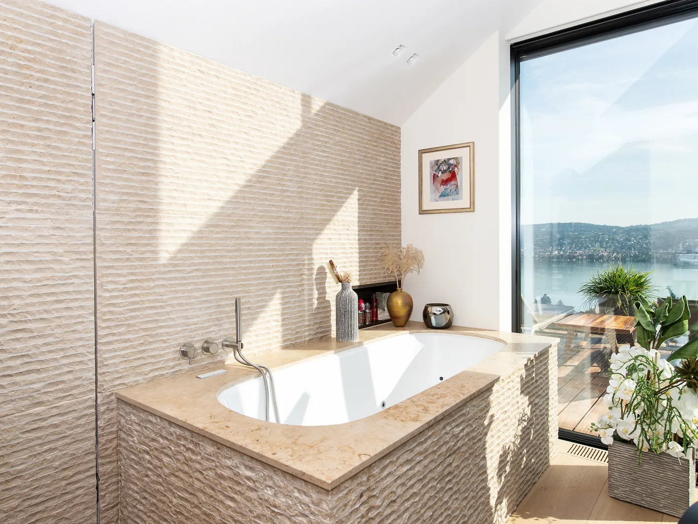 Gleichzeitig werden Wellnessräume immer stärker Teil der Architektur eines Hauses. Private Spa-Zonen, integrierte Ruheräume oder Wellnessbereiche im Garten verbinden Innen- und Aussenraum miteinander. Naturstein, Holz, Wasser und warmes Licht bilden dabei eine harmonische Materialwelt, die Ruhe und Qualität vermittelt.