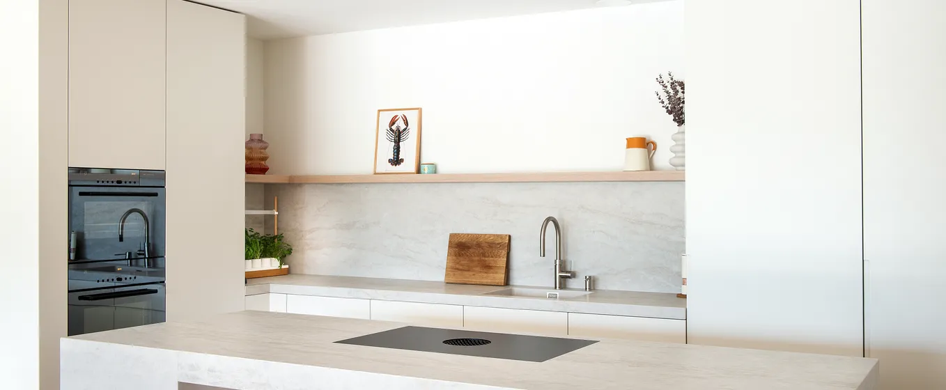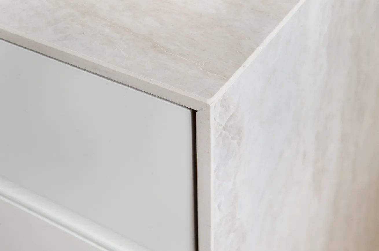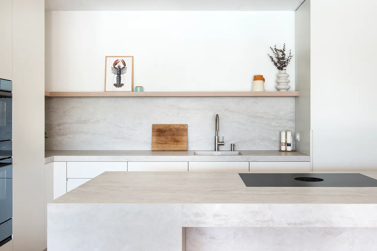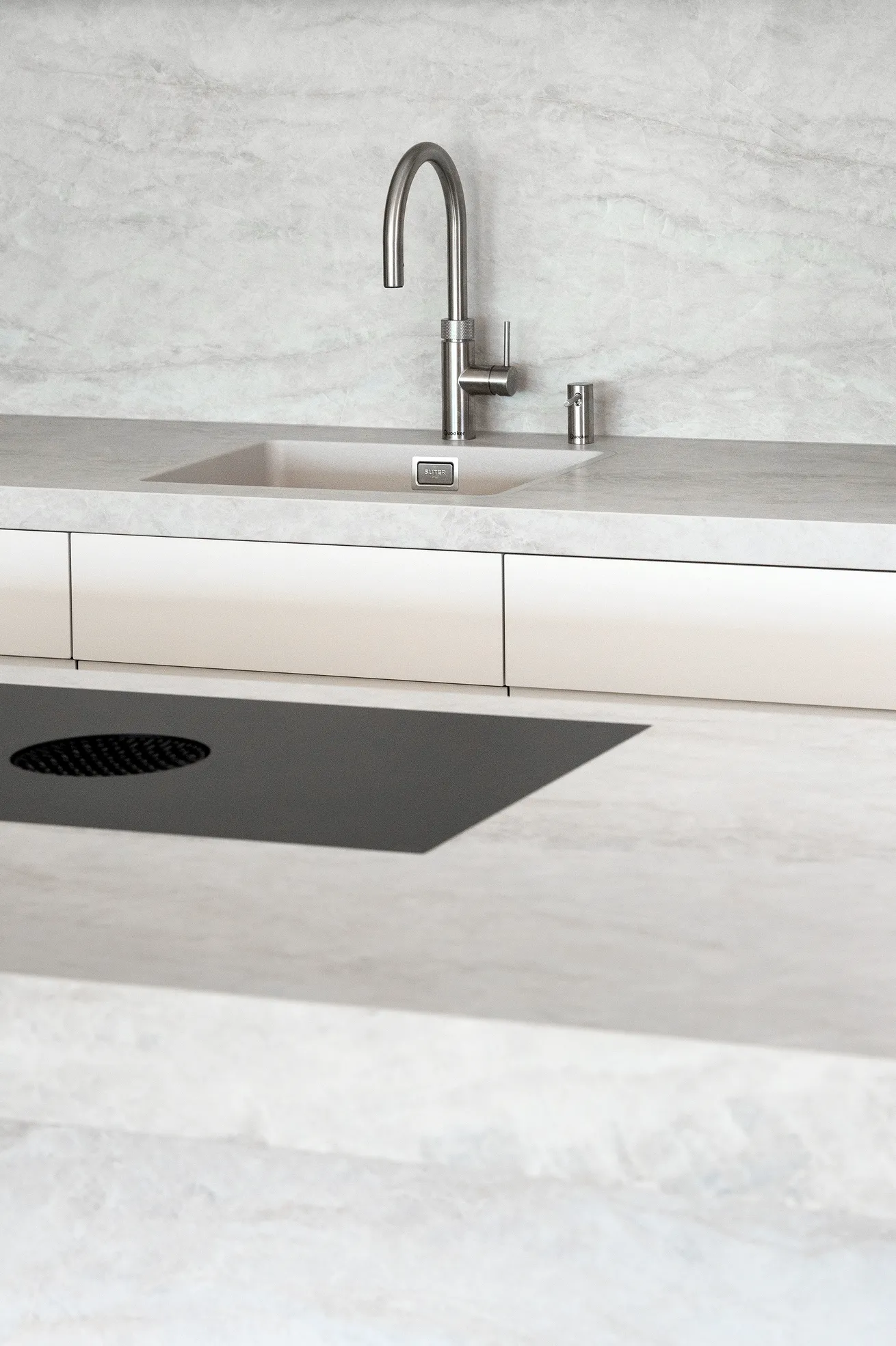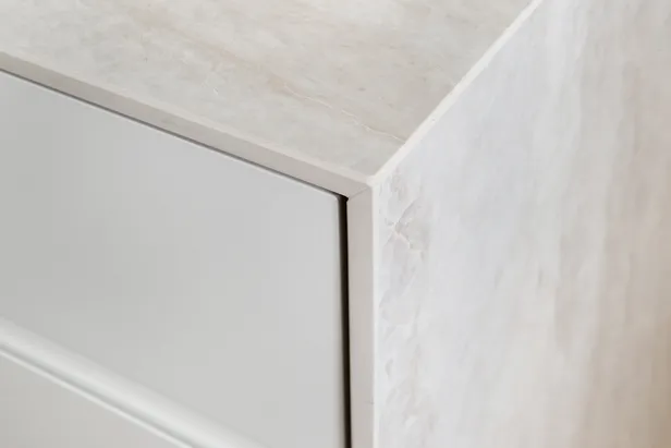 Die zurückhaltende, fein nuancierte Optik von Dekton Nara bringt Ruhe und Klarheit in den Raum. Sie eignet sich für Küchenabdeckungen, Rückwände und Möbeloberflächen ebenso wie für grossflächige Anwendungen im Innenausbau.
