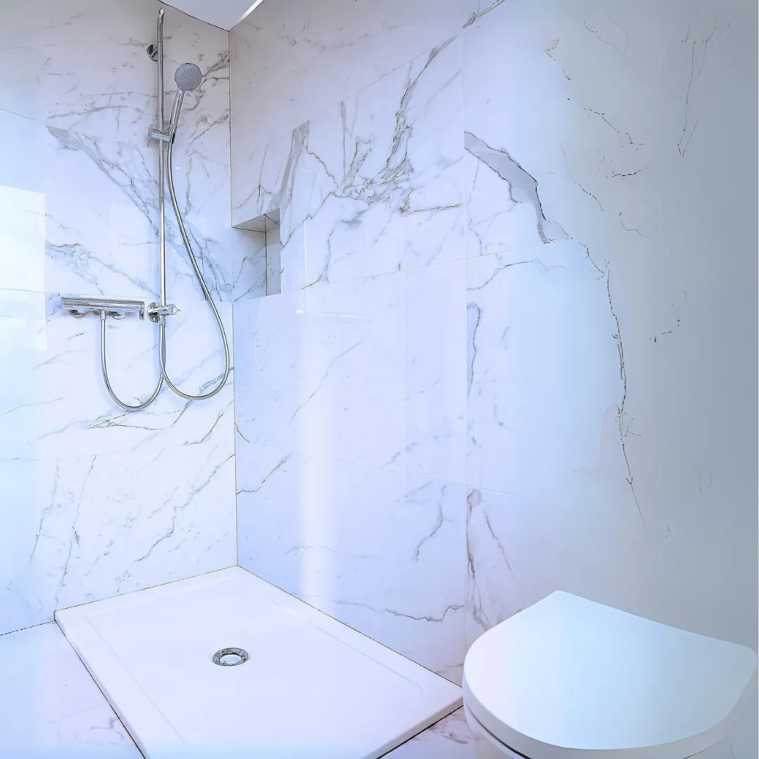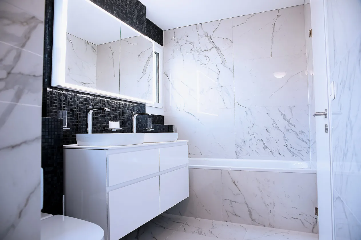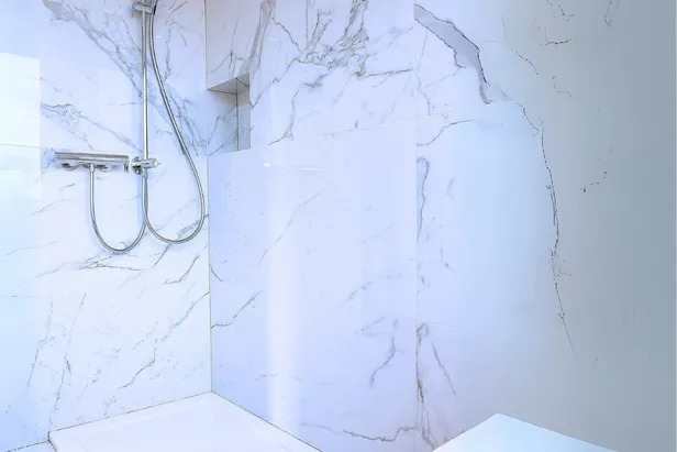 Gestalterisch sollten die Bäder die gleiche Wertigkeit wie die angrenzenden Wohnbereiche erhalten. Grossformatige Platten im Calacatta-Stil bilden daszentrale Element. Ihre marmorähnliche Maserung verleihen den Räumen eine luxuriöse, ruhige Atmosphäre.