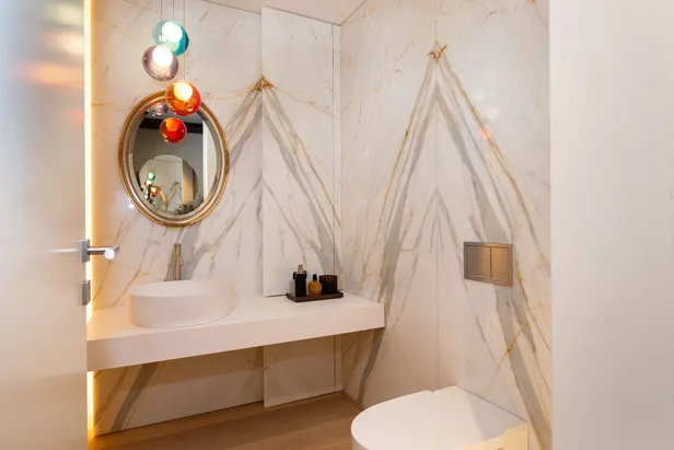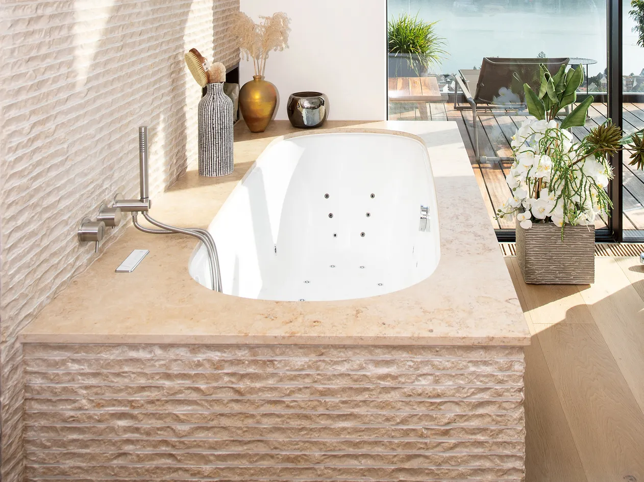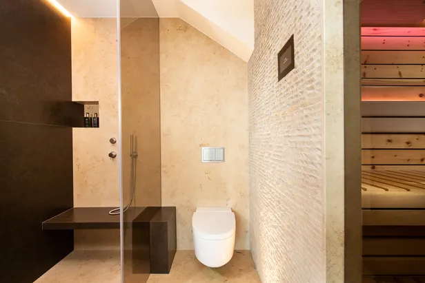 Wellness auf schönstem und höchstem Niveau: Dieses Private-Spa vereint warme Farben, natürlichen Kalkstein und eine exklusive Ausstattung zu einem wahren Rückzugsparadies. Whirlwanne, Regendusche, private Sauna: Was will man mehr zum Entspannen?