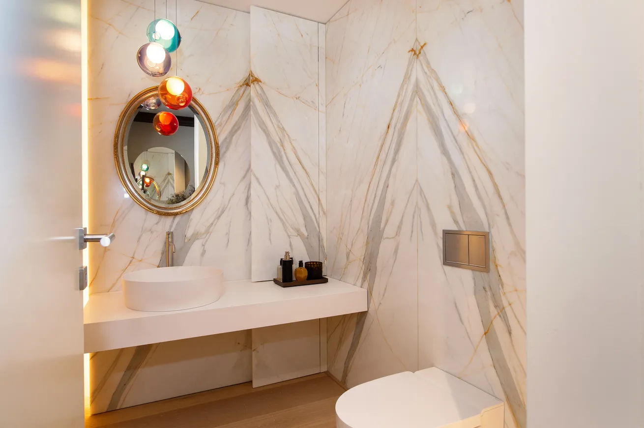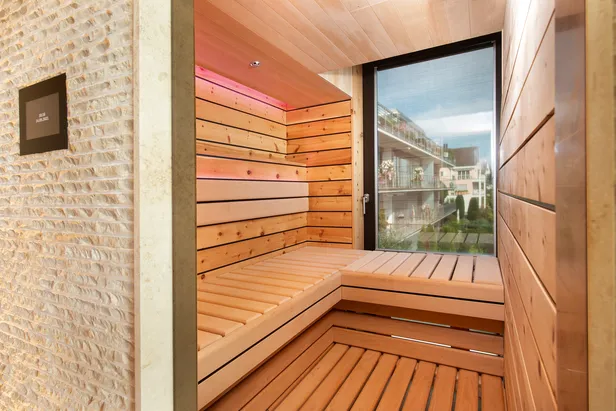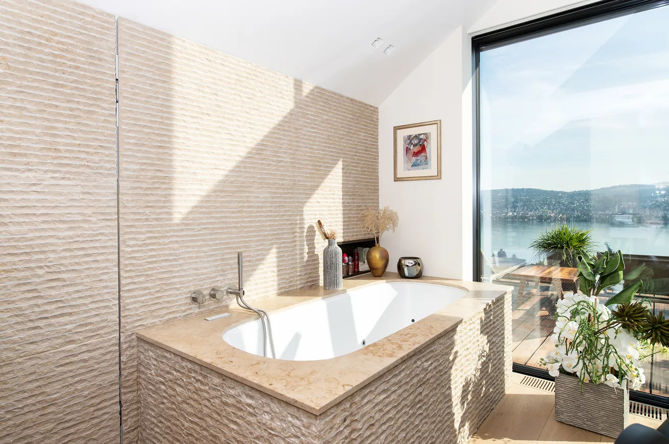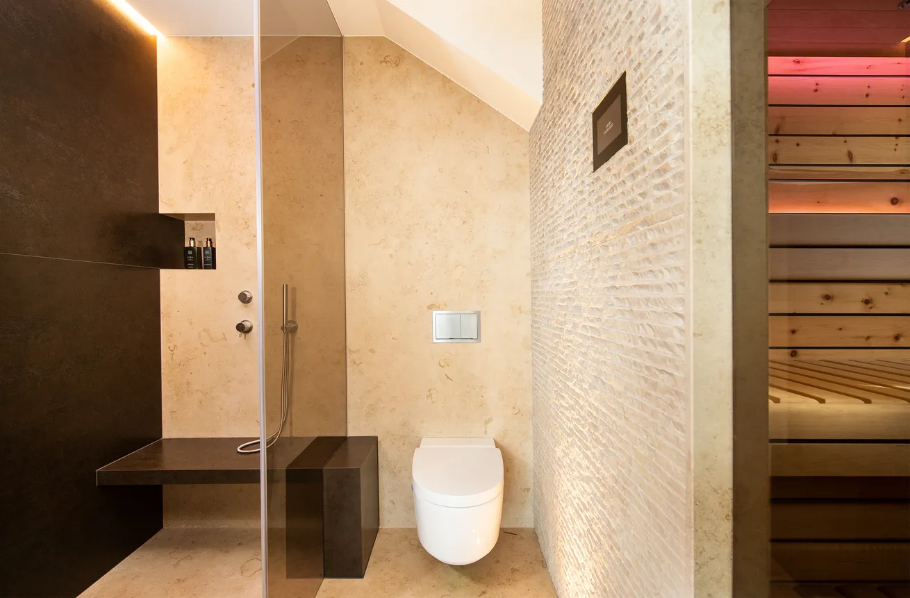 Ein weiteres zentrales Element ist die grosszügige Whirlwanne, eingebettet in die Natursteinarchitektur. Die Regendusche ergänzt das Raumkonzept. Direkt angrenzend sorgt eine private Sauna aus Arvenholz für wohltuende Wärme. Das Zusammenspiel aus Kalkstein, Holz und Licht erzeugt eine gute Balance zwischen natürlicher Materialität und moderner Ausstattung.