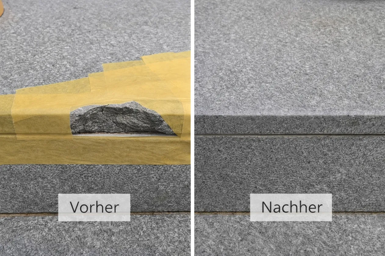 In solchen Fällen gibt es grundsätzlich zwei Möglichkeiten: Entweder die betroffene Oberfläche wird vollständig ersetzt. Oder der Schaden wird mit Baukosmetik repariert. Dabei werden beschädigte Stellen gezielt ausgebessert und farblich sowie strukturell an das bestehende Material angepasst. Typische Reparaturen sind beispielsweise
