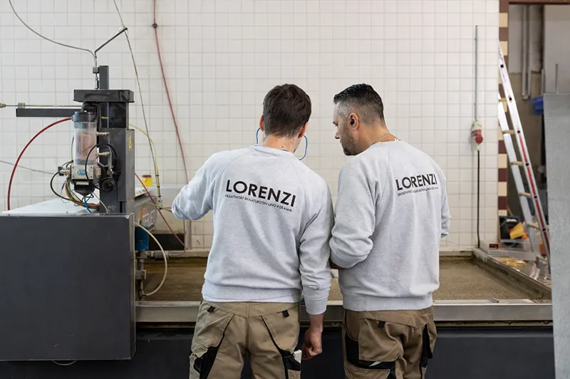 Lorenzi denkt in Stein: Wir gestalten Wände, Bäder, Waschtische und vieles mehr. Mit unserer eigenen Produktion für Küchenabdeckungen haben wir unser Angebot erweitert und können noch präziser auf Ihre Bedürfnisse eingehen. Alle Werkstücke entstehen in unserer modernen Werkstatt – aus Naturstein oder Keramik, in präziser Massarbeit. Küchenabdeckungen sowie grossformatige Platten werden digital ausgemessen, im CHD-System geplant und anschliessend mit CNC-Fräsen und Waterjet-Maschinen exakt zugeschnitten.